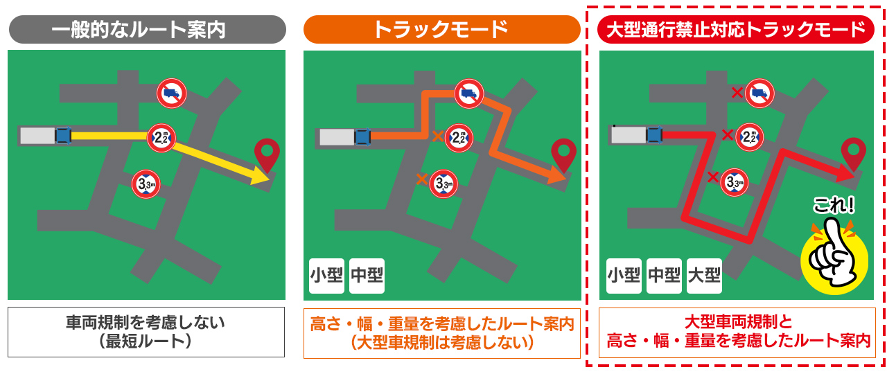 ●大型通行禁止標識対応の「トラックモード」を搭載しており、
