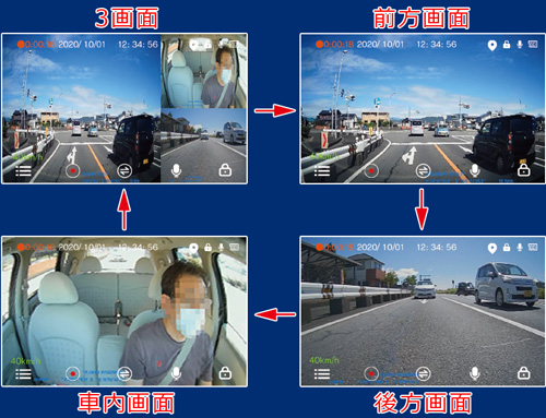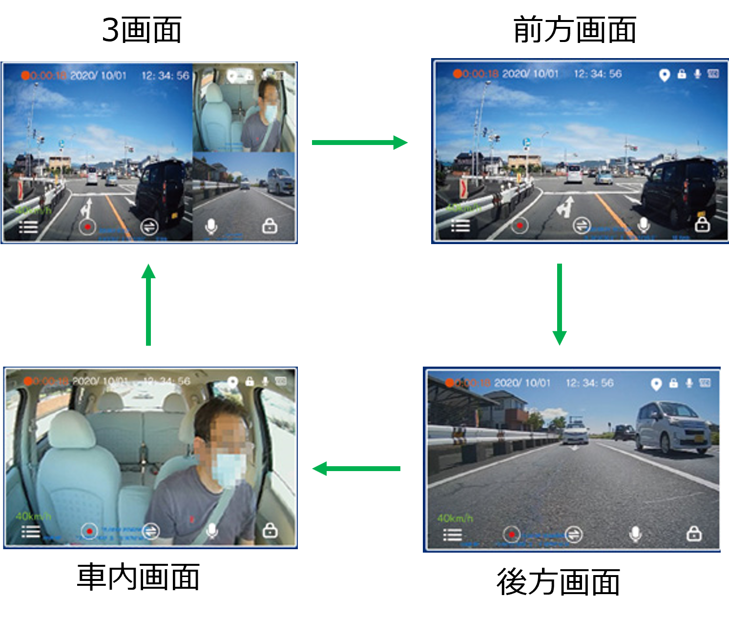 フロント画面 / 車内画面 / リア画面 / 3画面へと表示を切り替えられます。