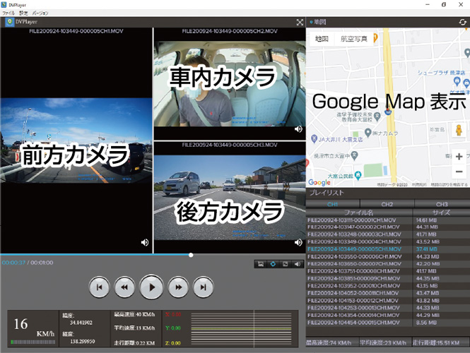 リアカメラ録画ファイルの映像・そしてGoogle Map上に自車位置が表示されます。