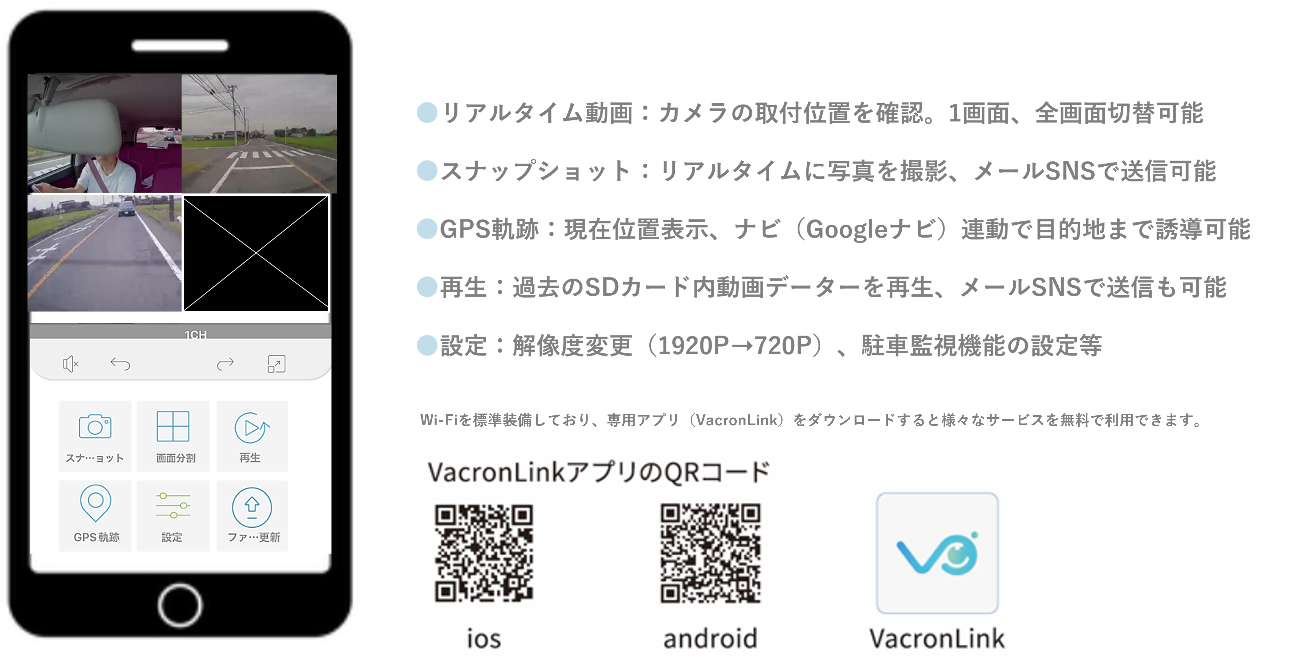 | 録画トリガー | イベント録画、ファイルロック、自動アップロード機能対応 | |