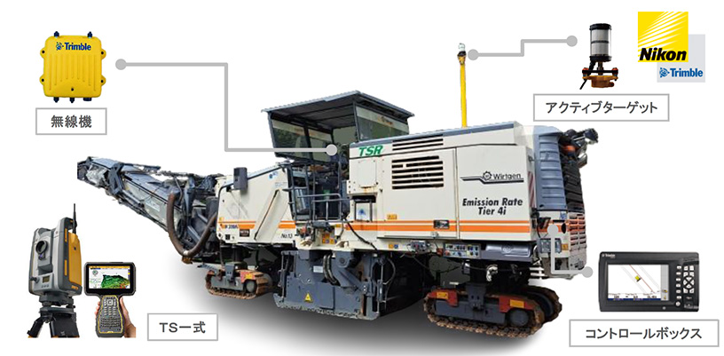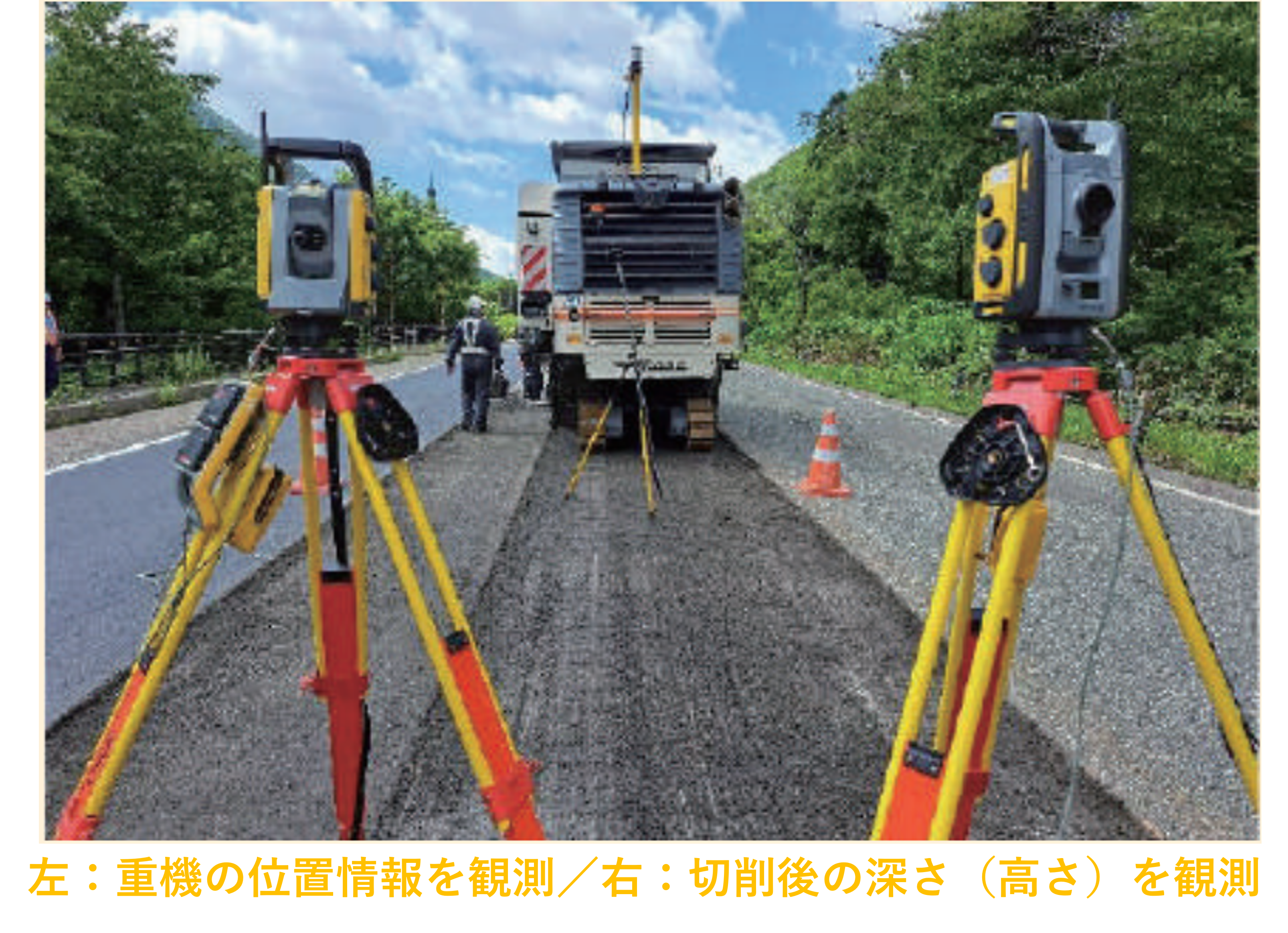 ●トータルステーションで高精度に重機の位置情報をリアルタイムに観測することで、