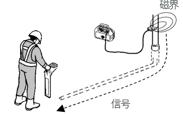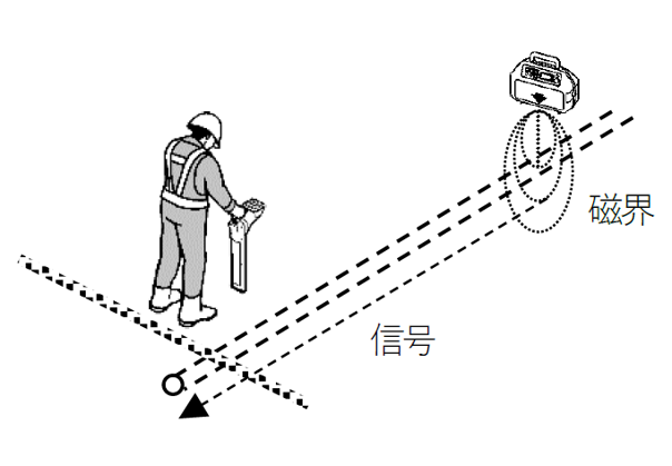 ●送信原理:送信器本体から出力される磁界を埋設物に誘導させる方式です。