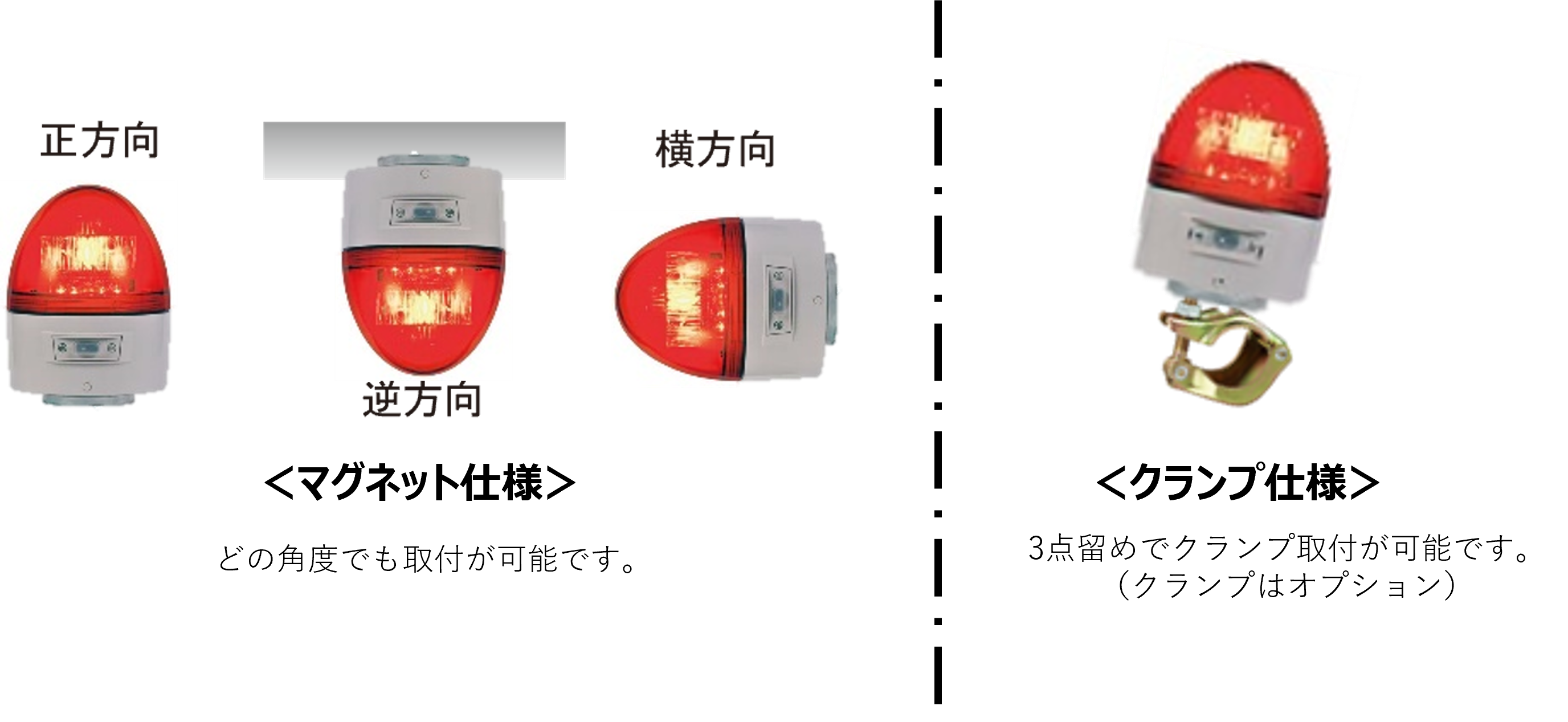 ●回転と点滅表示、ブザー有と無が選べます。(標準出荷時:回転・ブザー無)