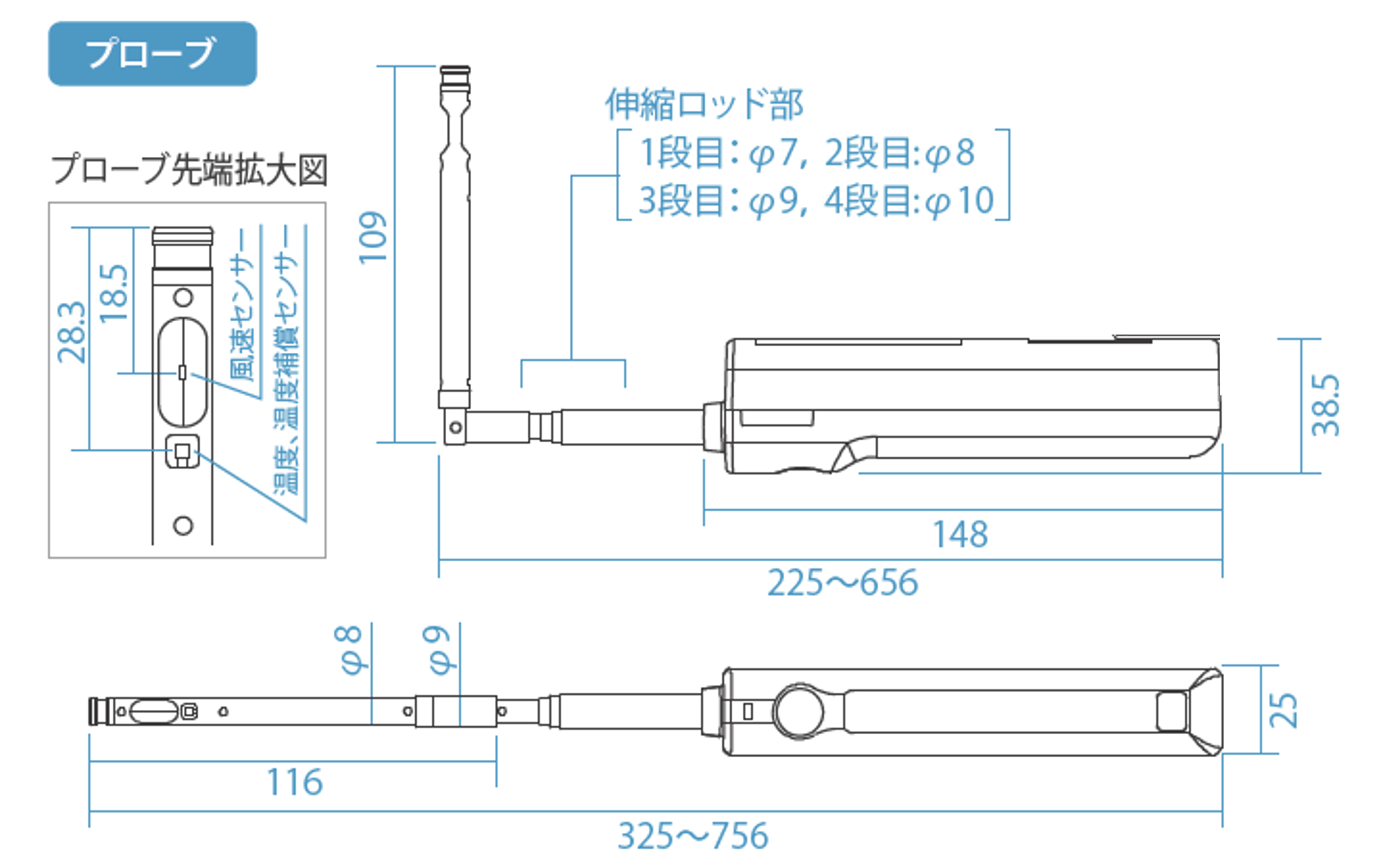 Bluetooth通信(スマートフォン・タブレットもしくは表示ユニットと接続)、 ケーブル接続(表示ユニットと接続)、 手元スイッチ(電源ON/OFF、測定値ホールドなど)、 LED表示(電池残量、Bluetooth通信状態)、 I・L両用伸縮式プローブ(mm目盛り刻印)、 三脚取付穴(ストラップ金具兼用) |