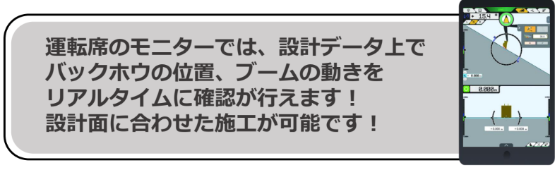 ●3D設計データをもとに、施工面までのバケット位置をガイダンスする技術です。