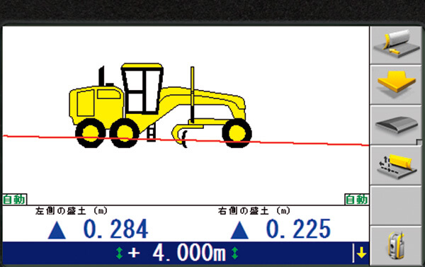 ブレードを設計面に自動的に合わせる「自動モード」オペレーターがモニターのガイダンスヲ見ながら排土板を