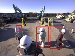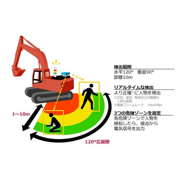 ●検知した人までの距離を検出し、設定した警報エリアに応じて、光や音で危険を知らせる建機・産業車両に取り付け可能なAIカメラです。