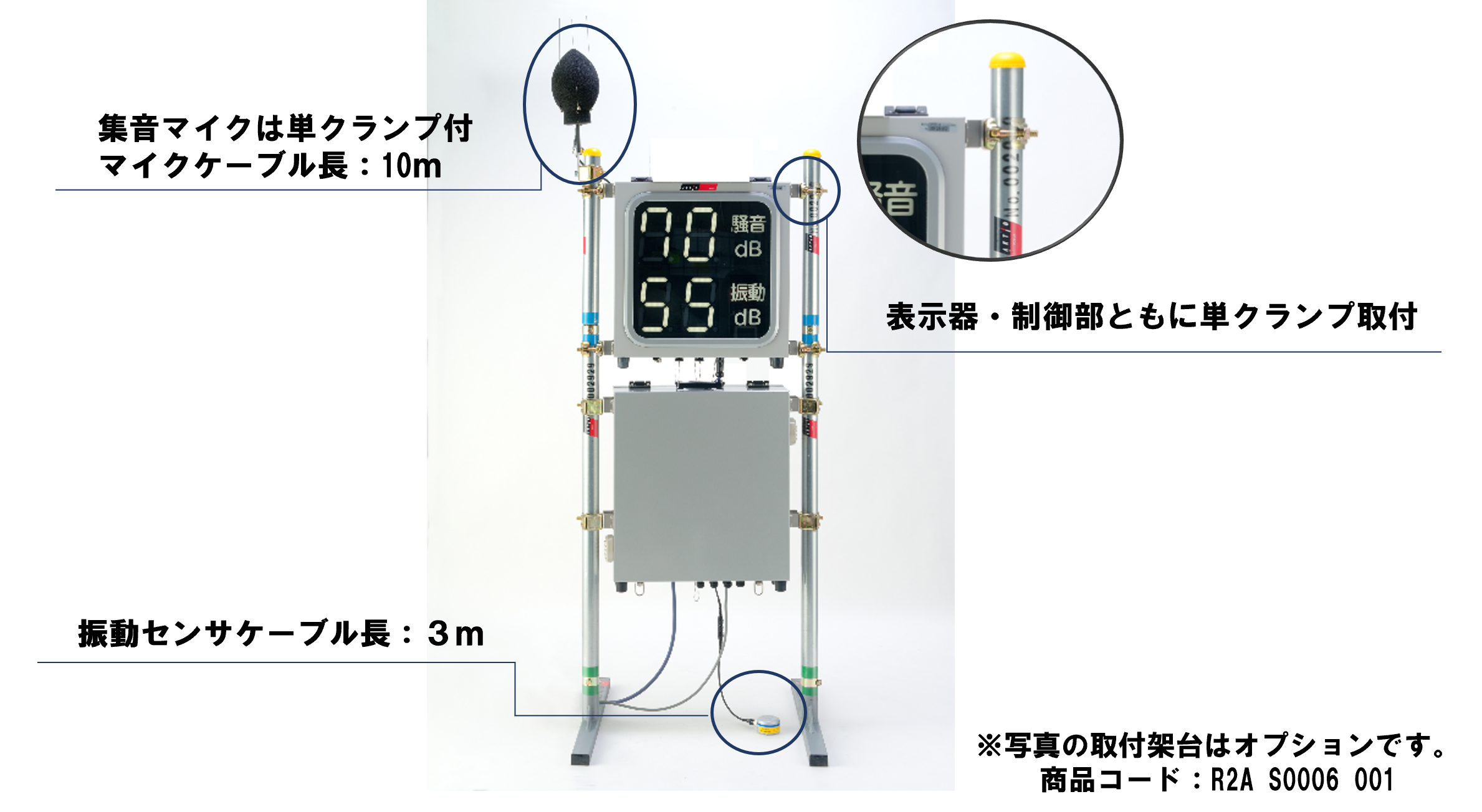 騒音・振動の各警報時に点灯し、警報をお知らせします。単クランプ取付金具と専用ケーブル5m付き、制御BOXに差込したら、すぐにご使用頂けます。 |