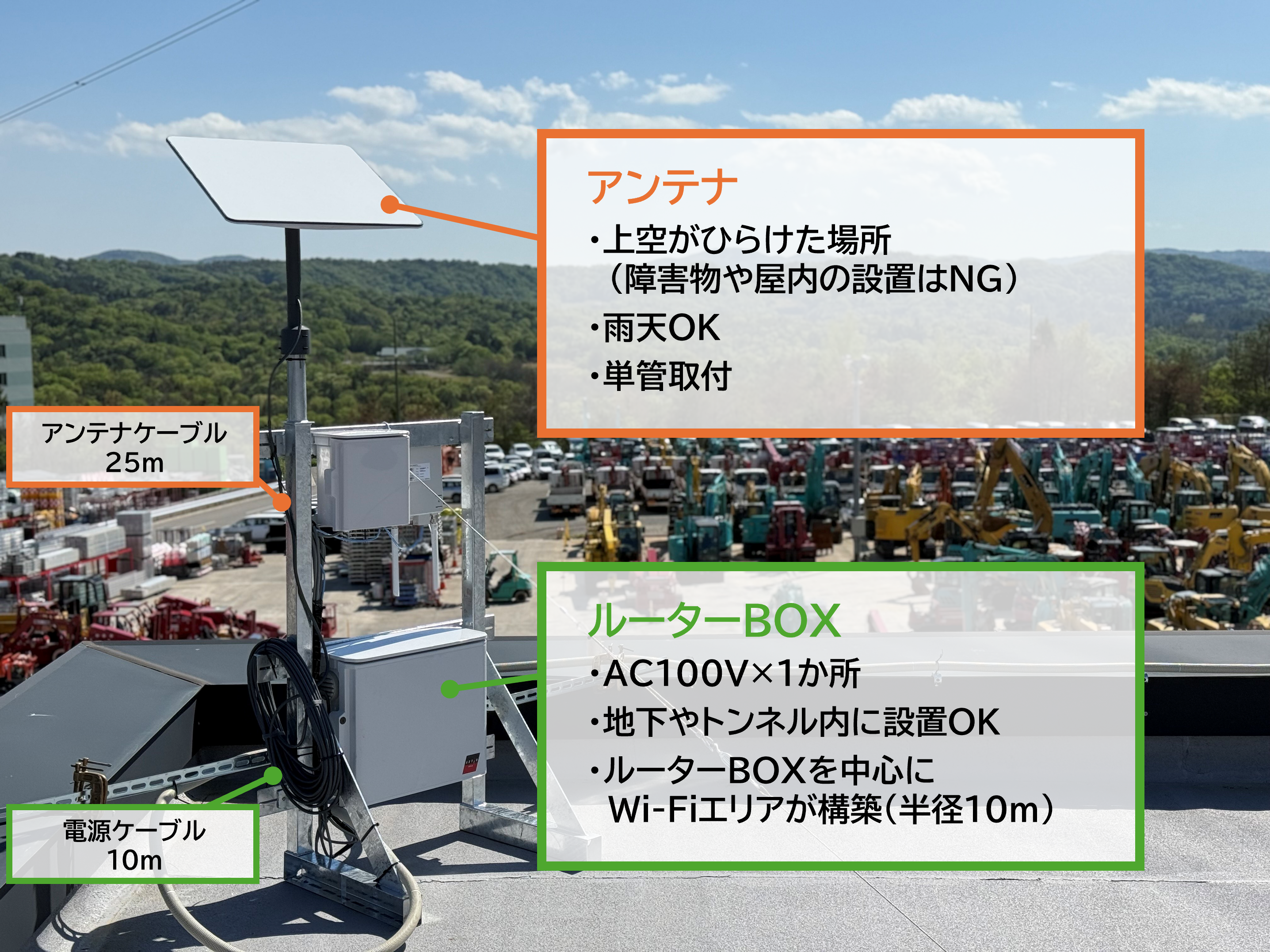 アクティオのレンタル構成品は写真とは一部異なります。(アンテナは単管マウント付、ルーターは防水ケースに収納しています)