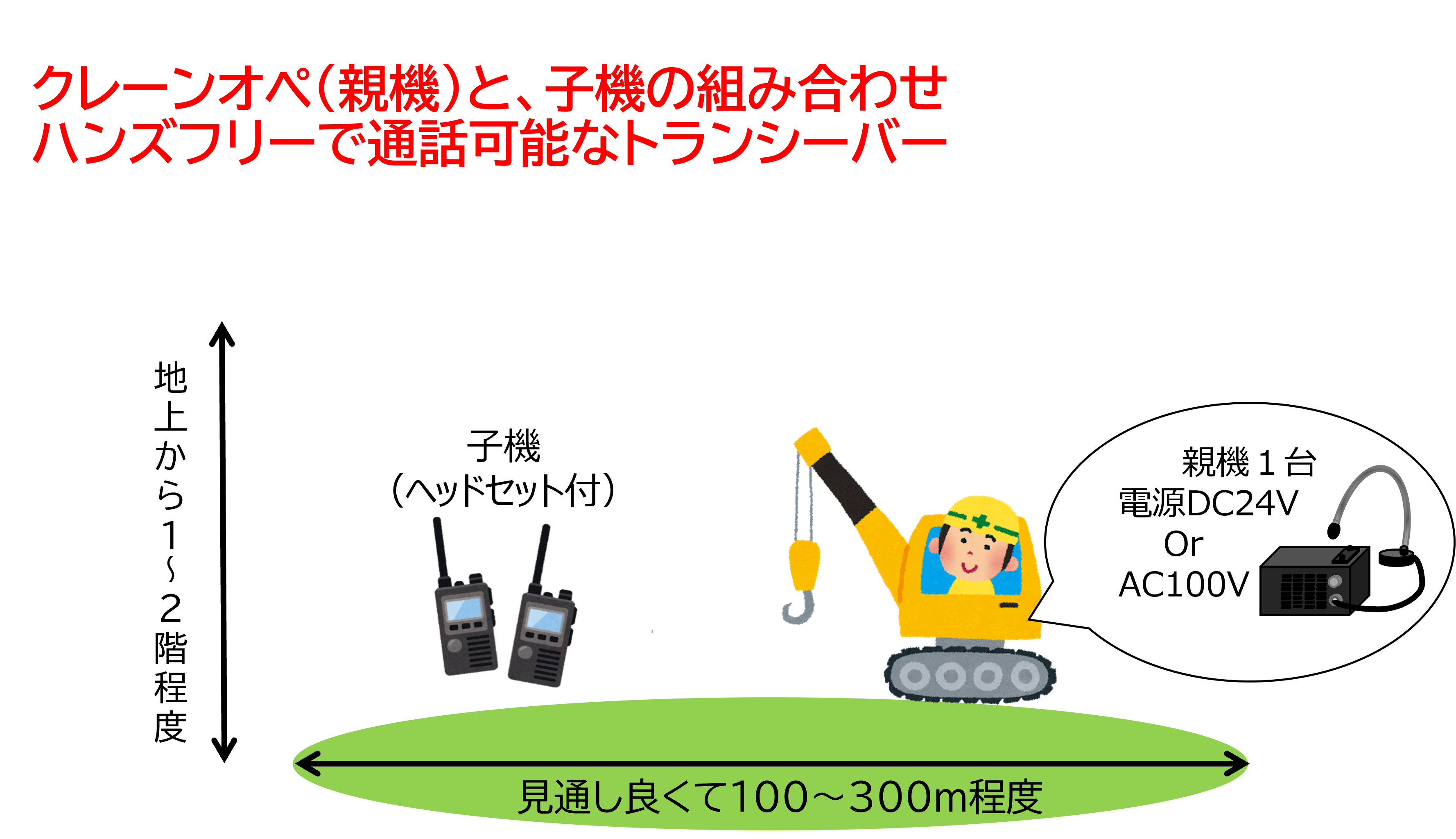 ●クレーンオペ用の親機1台と子機4台のセットレンタルで、最大5人での同時通話が可能です。